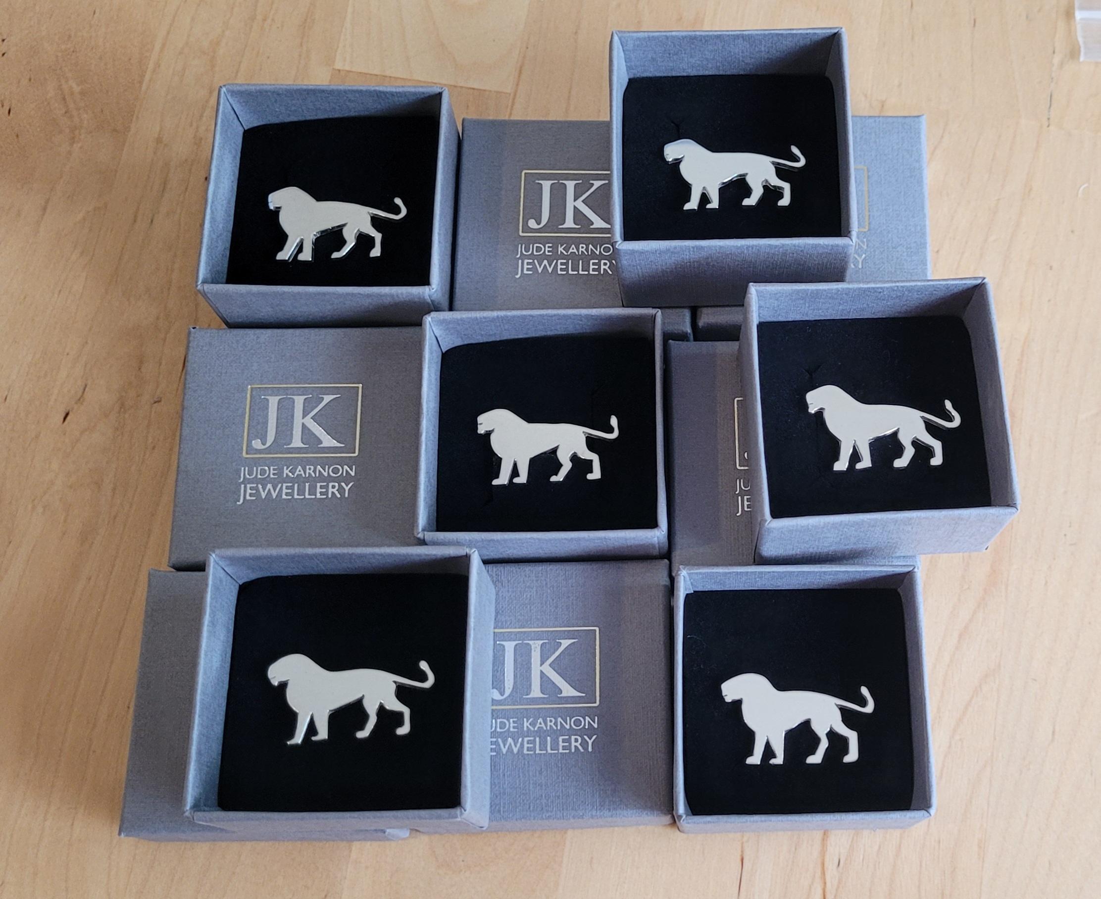 A pride of sterling silver Whipsnade Zoo lions within Jude Karnon Jewellery branded boxes.